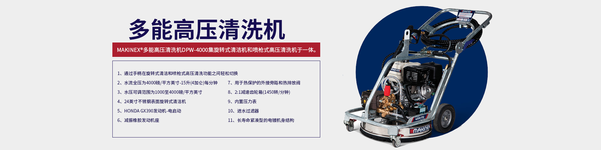 Makinex多能高壓清洗機DPW-4000具有無可比擬的多用性。雙清洗機功能和可調(diào)節(jié)的水壓使其完美適用于重型外部清潔應(yīng)用…
